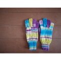 ブルーから紫、黄色の段染め糸で編んだ手袋です。