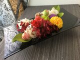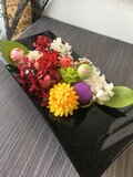シンプルながらも存在感のあるブラックのスクエアベースに華やかな彩りのお花をぎゅっと集めてみました。