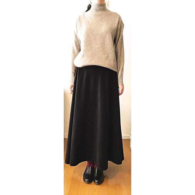 今季流行中のたっぷりめのセーターやタイツの色合わせで楽しめるスカートになりました。