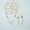 ネックレスの中心に宝石質セレモニアムーンストーンAAAのマロンカットを下げ、宝石質ヘリオドールAAAのペアシェイプブリオレットカット、宝石質アクアマリンAAAのペアシェイプブリオレットカット、宝石質プレナイトAAAのドロップブリオレットカット、宝石質ロンドンブルートパーズAAAボタンカット、ロシア産宝石質エメラルドAAAタンブル、極上カット宝石質ラブラドライトAAAのタンカット、淡水パールの順で下げました。