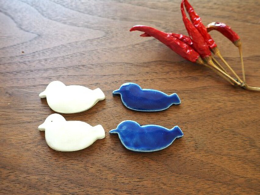 陶器で作った箸置き[青い鳥白い鳥]です。幸せの青い鳥をイメージしています。
