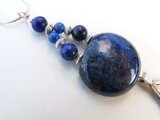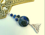 一番下にケルトのトリケトラのパーツ。三位一体をあらわします。その上にパイライトの入った美しいラピスラズリ。6ミリのラピスと4ミリのソーダライトで仕上げました。