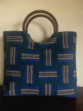 モスグリーン、浅黄、黄土色、黒、白の縞のバランスがとても美しい古布の布団生地、を剝いで丸い木の手の手提げを作りました。