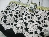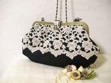 黒リネンにアンティークのギュピールレースをのせたがま口バッグ