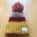 男の子、女の子どちらでもお使い頂けるカラーで編みました。被ると、大きめなポンポンとお子さんの小さな頭とのバランスがとても可愛いですよ。