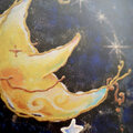 夜空に浮かぶお月さまとキレイ色のトリさんセミフレッドの飾りタイルです。