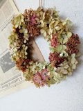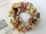 あじさい、カーネーション、貝細工などをアレンジしたアンティーク色のナチュラルなリースです。