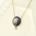 繊細で美しい花のカット模様が自然な輝きをより引き立てる、ヴィンテージの黒蝶貝ボタンにコットンパールを合わせた、上品な輝きが美しいネックレスです。