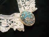繊細な刺繍の施されたアンティークレースの上にエメラルドグリーンの糸で