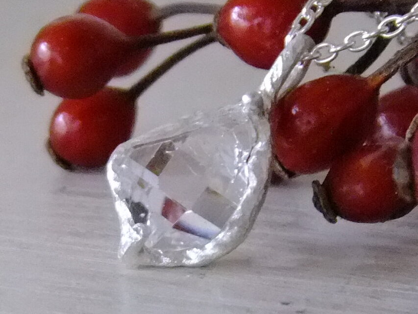 雫のようなフォルムで極めて透明度が高く凛とした煌めきのNY州産ハーキマーダイヤのシンプルなペンダントです*細かい結晶インクルージョンがさらに煌めきを添える唯一無二の結晶による1点モノをお楽しみ下さい*NY州産ハーキマーダイヤは高い人気と相反した産出減少により綺麗なものほど入手困難となっております*輪郭に合わせた石枠はアンティークマット仕上げ、925チェーン1.3㎜40㎝付き(長さのご希望がございましたら承ります)通常、黒化遅延処理を施しますが銀そのものの変化をお好みの場合は処理不要とお申し付けください*黒化防止ロジウムコーティングご希望の場合はチェーンとともに承ります(別途1200円)ゴールドGP+14kgfチェーンをご希望の場合はお問い合わせ下さい*仕上げ確定後に石留め致します*