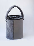 イタリア製星柄エンボスのウールを使った、円筒形のバケツトートです。裏面はグレー無地のフェイクファーと帆布の組み合わで、気分に合わせて2デザインお楽しみいただけます。カジュアルとシックのちょうど中間くらいの色合いで、色々な場面でお使いいただけますよ。