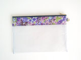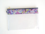 リバティの人気生地(ラミネート つや無)、 マーガレットアニー Margaret Annie(パープル)で中身が見えるクリアポーチを作りました。