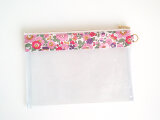 リバティの人気生地(ラミネート つや無)、 ベッツィ Betsy (ピンク)で中身が見えるクリアポーチを作りました。