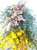 ランのお花の中でも大変可愛らしい小ぶりな黄色のお花のオンシジューム、ブルーアイス、ラグラス、タタリカなどをアレンジしたナチュラルなスワッグです。