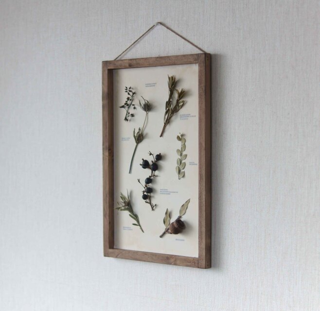アンティーク調に仕上げた自家製フレームに色褪せたドライフラワーを貼り付けました。
