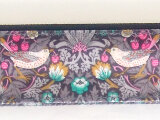 リバティの人気生地(ラミネートつや無)、Strawbery Thief ストロベリーシーフ(ダークブラウン)で開けなくても中身が見える便利なクリアポーチを作りました。
