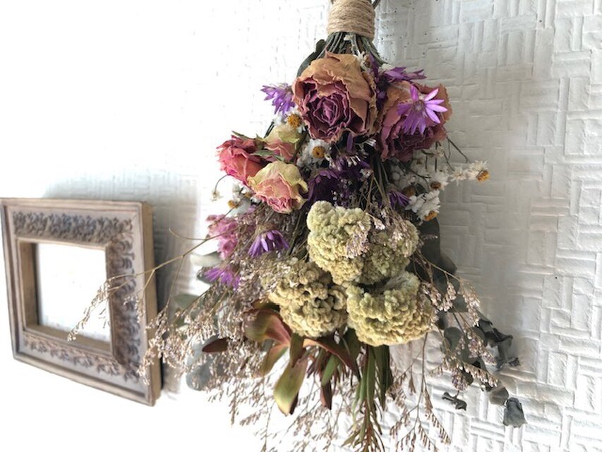 すべてナチュラルなドライフラワーを使用していますので時間とともに退色していきます、それもあわせてお楽しみいただければと思います。