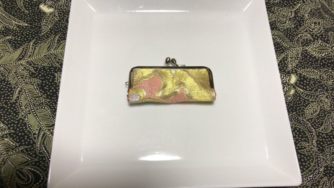 表地はゴールド×サーモンピンク柄帯を解いた生地を使いました。