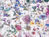 『英国の花図鑑』のイラストから着想を得てデザインされた柄です。繊細なタッチの植物画がデジタルプリントで写実的に表現されています。生地の地の色がホワイト、花の色がマゼンタピンク、ブルー、イエロー、レッドなど。葉の色が濃淡のあるグリーンです。