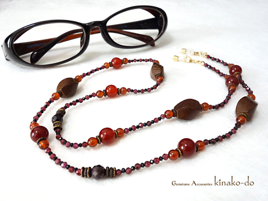 木目の美しいオークのウッドビーズをアクセントに、落ち着いたレッドカラーのアゲート、レッドブラウンが艶やかな高品質グロッシュラーガーネット(ヘソナイト)、カット面がキラキラと輝くガーネットとブラックスピネルを組み合わせた天然石グラスコードです。レッドカラーベースの天然石に木の温もりをプラスすることで首元をナチュラルに明るく彩るように仕上げました。