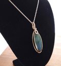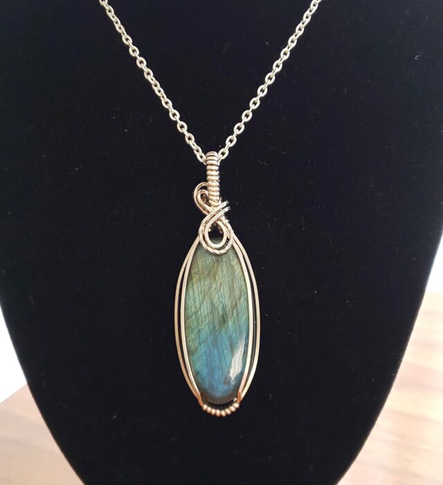 ブルーからグリーンにグラデーションするシラーが浮かぶラブラドライトをシルバーフィルドスクエアワイヤーでラッピングしました。