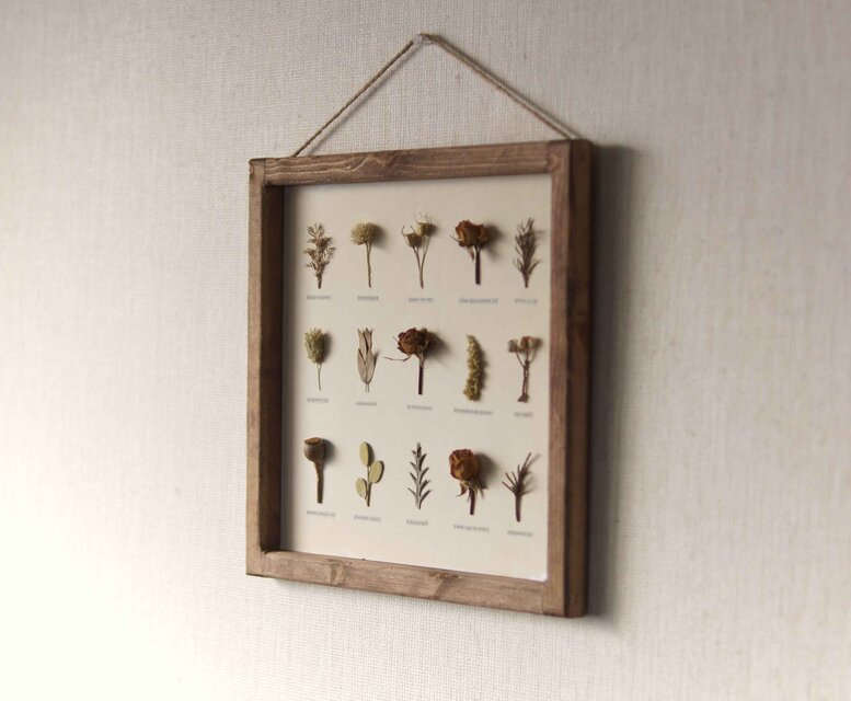 アンティーク調に仕上げた自家製フレームに木の実等を貼り付けました。