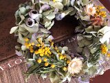 明るいイエローのミモザシャビシックなアジサイの上にか飾りました