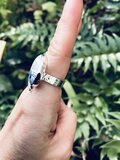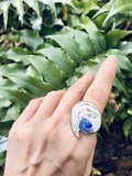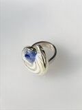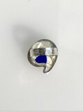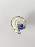 白い渦巻と明るい瑠璃紺色のガラスでできた貝殻の化石ようなリングです。
