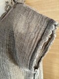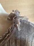 落ち着いたグレージュ系の生地に、縦方向のしわ加工(プリーツ)が施されています。首元や袖口の切りっぱなし(フリンジ状)のディテールが、ラフで抜け感のある印象を与えています。