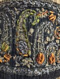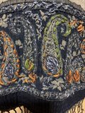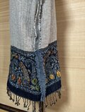 刺繍パネル(裾部分): 最も目を引くのがこの部分です。インディゴ染めのような深いネイビーの生地に、ペイズリー柄の繊細な刺繍が施されています。