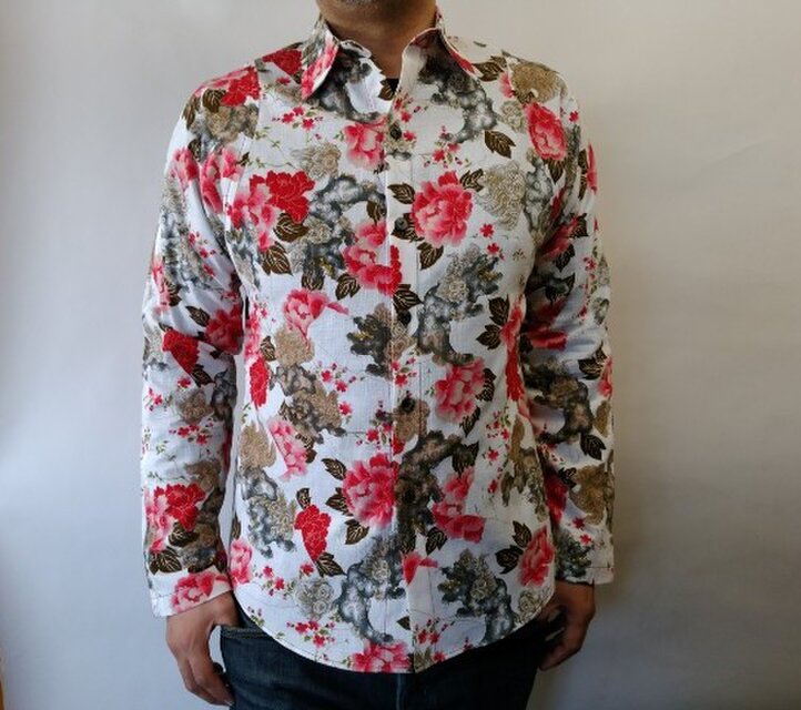 新作手作り長袖和柄シャツ(唐獅子牡丹)