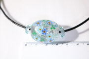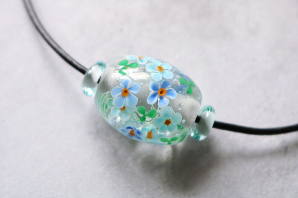 忘れな草は表面に描いたのではなく、ひとつずつガラスでパーツを作り、溶かしたガラスに埋め込みながら制作しております。