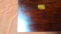 樹種は薄く削ったアフリカンチェリーの板を、裏面と側面は黒で、表面は白っぽく仕上げた平ら