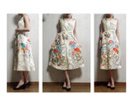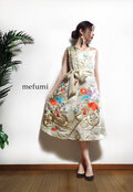 繊細で美しく優美な刺繍の花々と、光の加減で鶴が舞う姿が心奪われるベースで彩られた素敵なアンティーク振袖をほどいて、フォーマルワンピースをお作りいたしました。