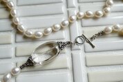 長さ8mm程度の美しい上質なライス型ホワイトパールをシルク糸で1粒ずつ結びながらつないでいったネックレスです。