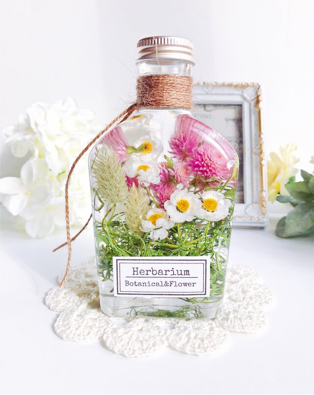 ハーバリウムとは植物標本のことで、特別に配合されたオイルにドライフラワーやプリザーブドフラワーを浸した植物標本です