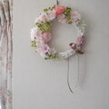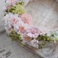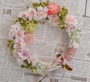 山桜の咲く頃の山肌は木々の若芽のライトグリーンと桜の優しいピンク色のコラボレーションがなんとも言えず美しくいつまでも見飽きません。その色合いをリースに再現してみました。若芽のライトグリーンは絶妙なグラデーションのかすみ草とピンポンマムを使っています。ピンク色は八重桜とピンポンマムとジニアを使ってみました。アーティフィシャルフラワーを中心的にしたプリザーブドフラワーをミックスしたリースです。春のお部屋のインテリアに咥えていただけたらと思います。
