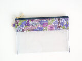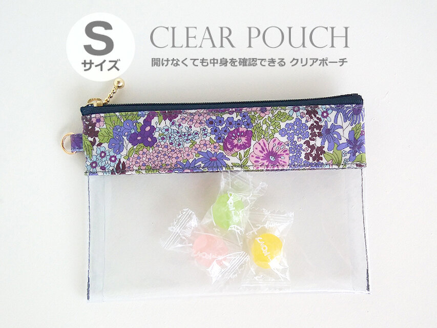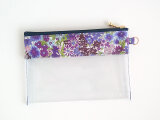 リバティの人気生地(ラミネートつや無し)、マーガレットアニー Margaret Annie(パープル)で中身が見えるクリアポーチSサイズを作りました。