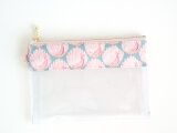 リバティの人気生地(ビニールコーティングつや無)、Peacocks of Grantham Hall ピーコックス・オブ・グランサム・ホール(ダークグレー)で中身が見えるクリアポーチSサイズを作りました。
