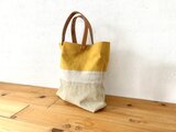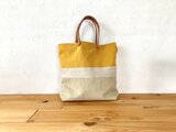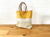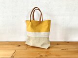 たんぽぽの色のような黄色と、生成り色のアンティーク加工の帆布と、間には内袋と同じ生成りの麻を使いました。とても手触りの良い生地です。