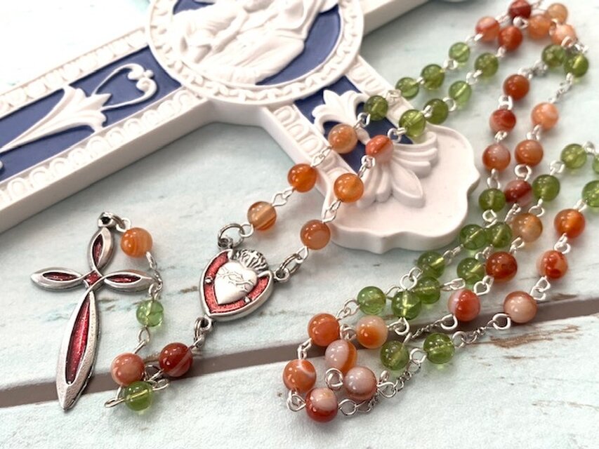 古くから「幸運」「幸福」を呼ぶ石とされ世界中で使用されてきたカーネリアンと、「太陽の石」として崇拝されてきたペリドットを使用したロザリオです。