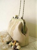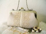エクリュ(淡いベージュ)リネンにアンティークギュピールレースをのせたがま口バッグ