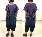 タイ東北地方の伝統工芸、草木染手織り綿で着こなしやすい五分袖チュニックを作りました。とても人気の高い孔雀柄が優雅で美しいです。画像では分かりにくいですが裾にある白い波型線の間には薄藍色の線があります。