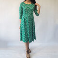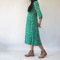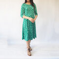 \鮮やかな緑色が映える生地。植物の枝葉のようなプリント柄が可愛らしい印象です/