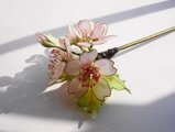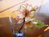 卒入学の季節になりました。お着物で出席される方も多いと思います。お子様の晴れの日にさり気なく見守るような桜の簪を作ってみました。アメリカンフラワーの作品です。アメリカンフラワーはワイヤーで形作った花びらに樹脂を張ったガラスのような透明感のある美しい造花ですが,そのままではとても繊細です。そのため強化剤によってコーティングすることで強度を保つのですが,私は更にUVレジン(樹脂)を使ってダブルコーティングしております。見た目よりも丈夫な作品作りを心がけ皆様に安心して身に付けていただけたらと願っております。