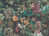 『英国の花図鑑』のイラストから着想を得てデザインされた柄です。繊細なタッチの植物画がデジタルプリントで写実的に表現されています。生地の地の色がダークグリーン、花の色がイエロー、オフホワイト、ピンク、レッドなどです。葉の色が濃淡のあるグリーンです。全体的に彩度の低い色合いです。