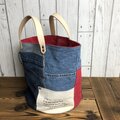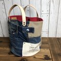 日本発のALBERTON®アーミーダックのバイオウォッシュ生地とジーンズ(新品)を解体して組み合わせ、バケツ型のバッグを作りました。バッグ底は直径約25cmの円で芯が貼ってので安定してますが、全体的にクタっとしたバッグです。