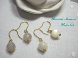 【素 材】淡水パール(オレンジピンク・天然色・約0.5cm)、リバーストーン・ホワイトシェル・グレーアゲート(各約0.6cm)玉ピン・フックピアス(メッキ)