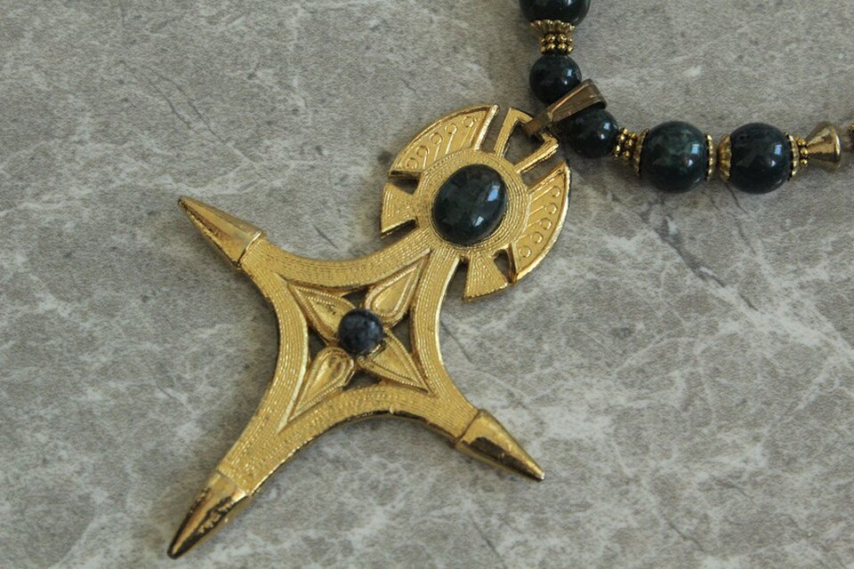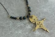 アンティークのゴールドのクロスのパーツに、オーバル型のブラッドストーンのカボッションと4ミリのスノーフレークオブシディアンのカボッションをはめ込みました。 6ミリと8ミリのブラッドストーンのビーズを組ませ、黒の皮ひもで仕上げてあります。
