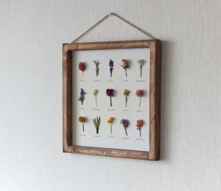 アンティーク調に仕上げた自家製フレームにドライフラワー、木の実等を貼り付けました。